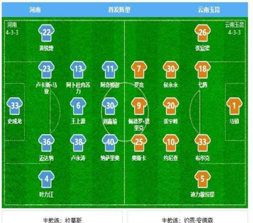 钟义浩停赛加上卡多索伤病,拉莫斯此役对河南队首发阵容做出数处调整。门将史成龙首次代表河南队在中超首发出场。四后卫保持稳定,从左至右依次为黄锐锋、马亚、迈达纳和叶力江。双后腰依然是队长王上源联袂卢永涛。肉苏力代替钟义浩出现在右边翼,阿奇姆彭依然在左路。老将刘鑫瑜突前,纳萨里奥前场自由人角色。