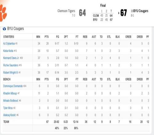 北京时间今日,在NCAA常规赛中,杨百翰大学以67-64完成22分大逆转,击败了克莱门森大学。